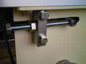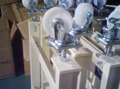 ベルトコンベヤー 片側あるいは両側に作業台を付けテーブルタイプにすることも出来ます。 駆動部の絞りローラーで、主にベルトのテンションを張ります。またベルトがセンターを走行するように左右のアジャストボルトで調整します。 移動を前提に使う場合は、ストッパー付キャスター仕様にします。 |